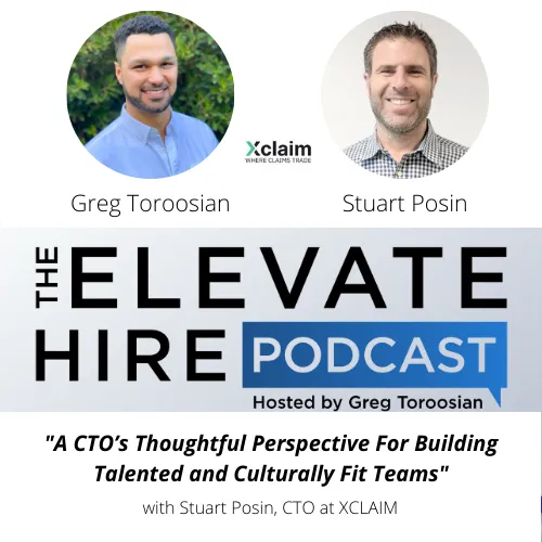 In this episode of Elevate Hire, Greg Toroosian interviews Stuart Posin, the Chief Technology Officer at XCLAIM, about how to build talented and culturally fit teams in both startups and growing companies. They also talk about the differences between being an internal versus external technology advisor, the effects of COVID-19 on the recruitment process, and how employees can be their authentic selves while at work. Stay tuned.